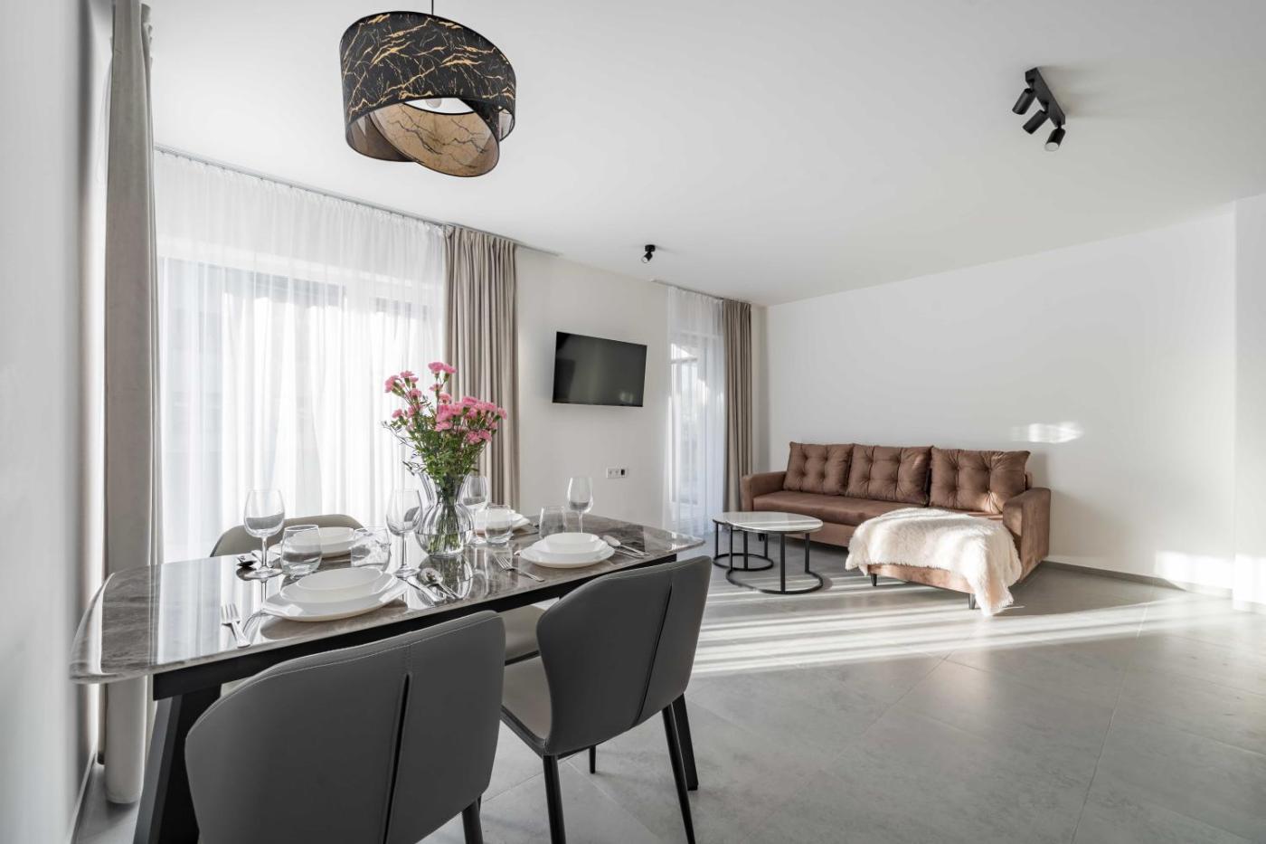 Apartament z 1 sypialnią. Boasting a private entrance, this air-conditioned apartment comes with 1 living room, 1 separate bedroom and 1 bathroom with a shower and a hairdryer. Guests can make meals in the kitchenette that features a stovetop, a refrigerator, a dishwasher and kitchenware. A seating area with a flat-screen TV, a coffee machine and a terrace are available in this apartment. The unit has 2 beds. Apartament - 4 osobowy. Powierzchnia pokoju ok.: 44 mkw.